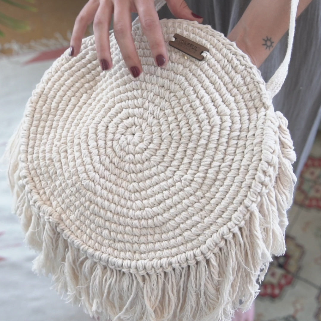 Bolsa tejida a mano, de algodón natural en crudo. Ideal para complementar tu vestimenta con un tono neutro, fácil de adaptar con cualquier atuendo. Pieza artesanal con fijador para repeler líquidos.