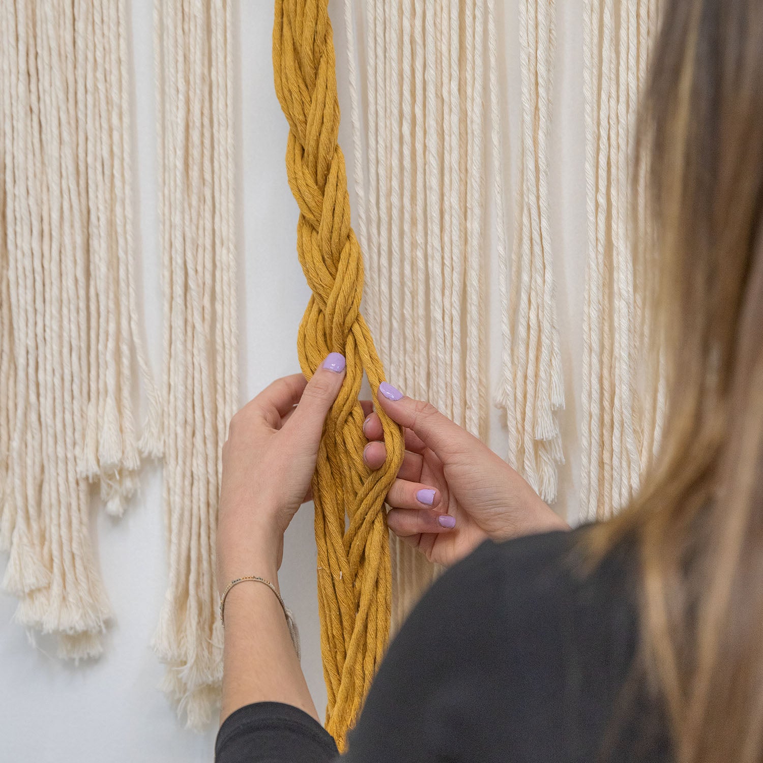Te enseñaré las diferencias entre la técnica de macramé y tramado textil. Esta última es la que emplearemos para tejer tu lienzo que al final de la sesión, te podrás llevar a tu casa.